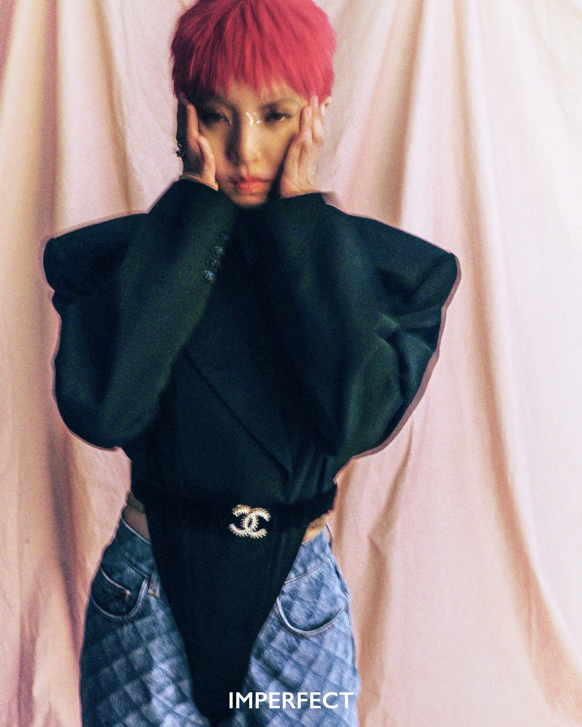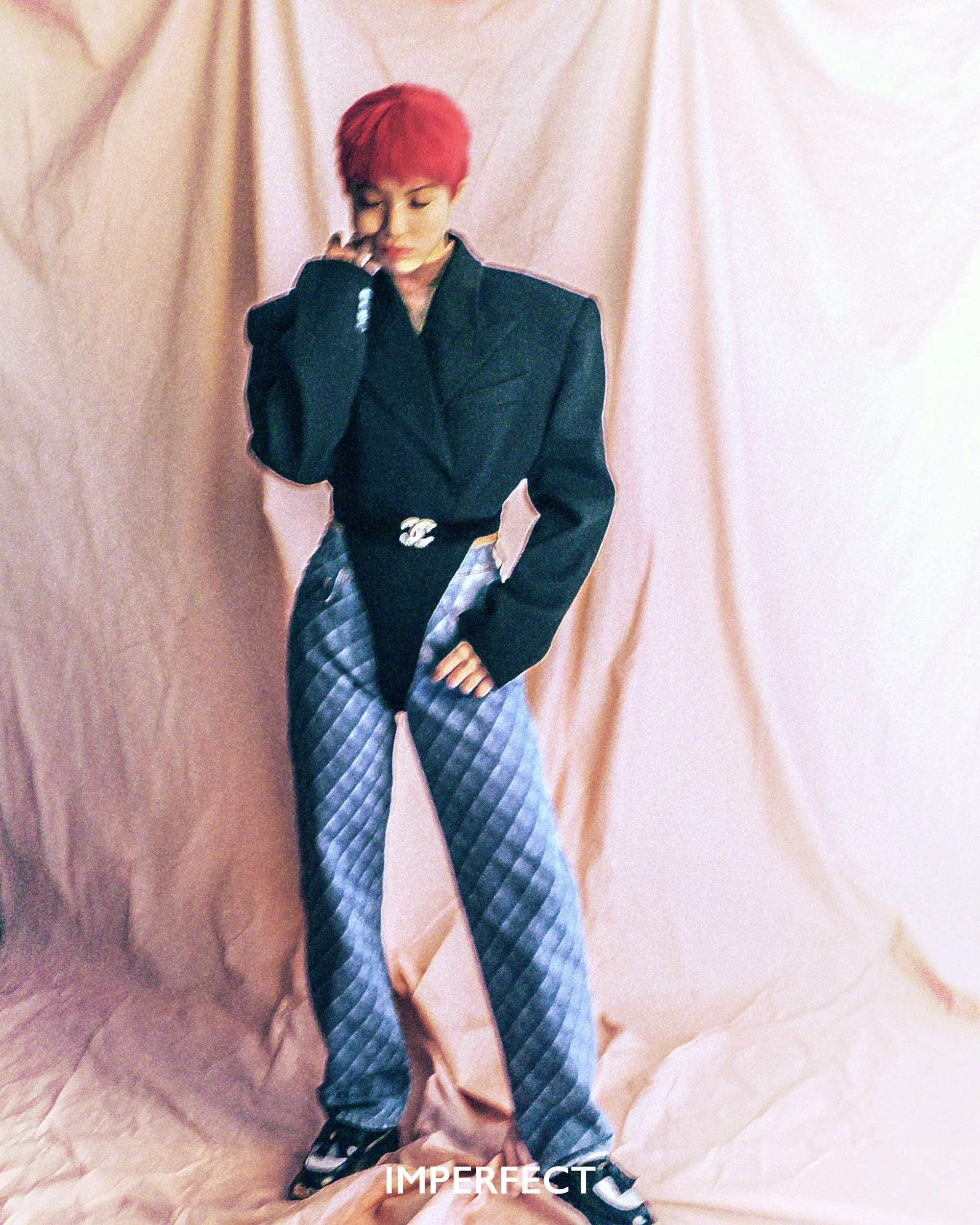 jacket from MUGLER @ FARFETCH; top from DION LEE @ LANE CRAWFORD; jeans, belt & jewellery from CHANEL; shoes from SANDRO