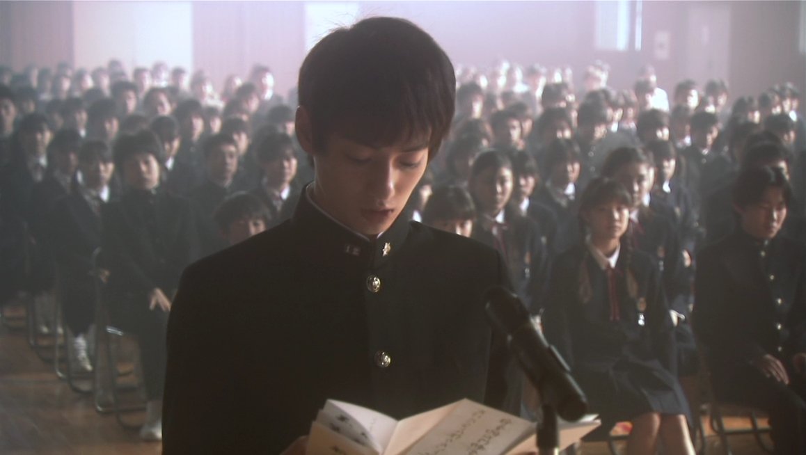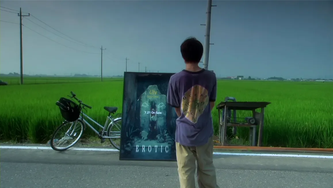 蓮見就是這樣活著的。在學校,他是被欺負的那個,星野命令他做各種屈辱的事,他不能反抗,也不敢反抗。他唯一能做的,就是在放學後戴上耳機,站在綠油油的稻田中央,把自己交給莉莉周的歌聲。那畫面很美,看起來像是某種救贖,但其實不是。那只是逃離,而逃離從來都不是救贖。